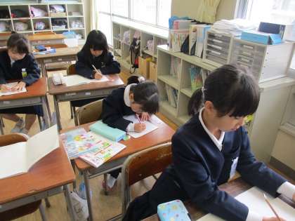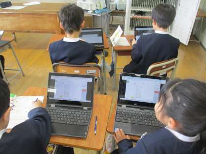 算数の「わかりやすくあらわそう」の学習では、クロームブックを使ってグラフや表にしました。「グラフにすると分かりやすい」「もっとパソコンができるようになりたい」など、ノートに感想を書きました。