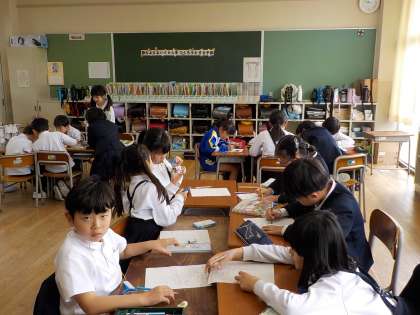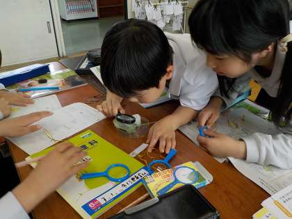 今朝、3年生の教室に、モンシロチョウの卵がやってきました。さっそく観察してみましたが、大きさは1mmにも満たない小さな卵です。子供たちは虫めがねを使って真剣に観察していました。