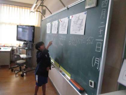 算数「直方体や立方体の体積」の学習では、L字型立体の体積の求め方について考えました。互いに相談しながら様々な求め方を考え、学んだ求め方を最後の練習問題でしっかりと生かすことができていました。