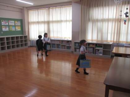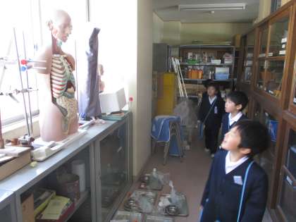 学校にもどんどん慣れてきた1年生。今日は、学校にある部屋をもっと詳しく知りたいと、グループで学校探検に行きました。理科室の人体模型に驚いたり、体育館の器具庫をのぞいたりするなど、どんなものがあるのか楽しみながら探検していました。