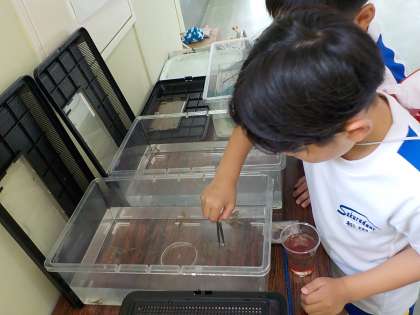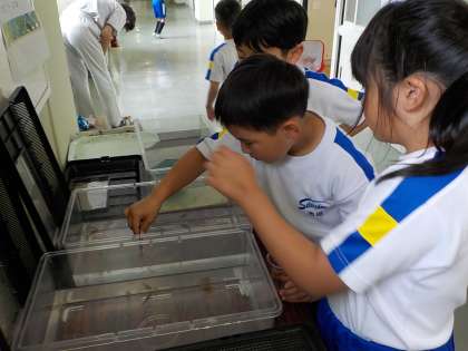 今日の桜っ子タイムに、サンショウウオの水替えとえさやりを行いました。興味がある3年生が、きれいな水の入った新しい水槽にサンショウウオを移し、えさをあげました。サンショウウオは元気そうです。