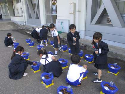 9日に植えたあさがおの芽がどんどん出てきています。1年生の子供たちは、毎朝あさがおの水やりをして、「芽が出たよ」「葉っぱが、たねの帽子をかぶっているよ」とあさがおの様子をうれしそうに報告してくれます。
