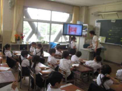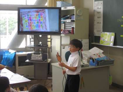 生活科「がっこうたんけん」では、自分の調べたい教室を探検し、見付けたことをカードにまとめました。今日は、カードに描いた絵を見せながら、発見したことをみんなに伝えたり、自分の教室と比べて分かったことを伝えたりしました。