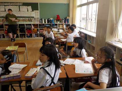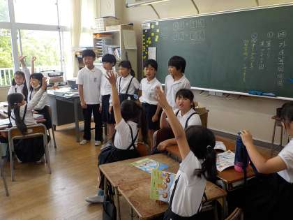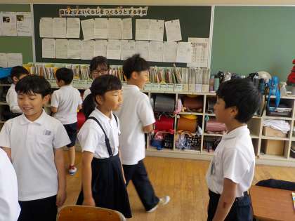 今日の外国語活動の時間は、前回に引き続き、「How are you? I'm 〜.」の学習のまとめの時間でした。級友や先生と会話を楽しんだり、グループごとの発表を聞いたりしました。