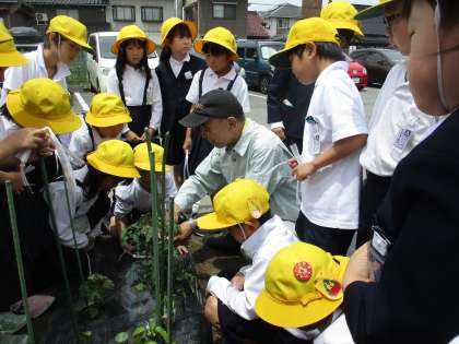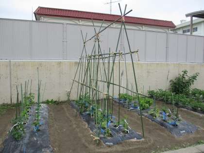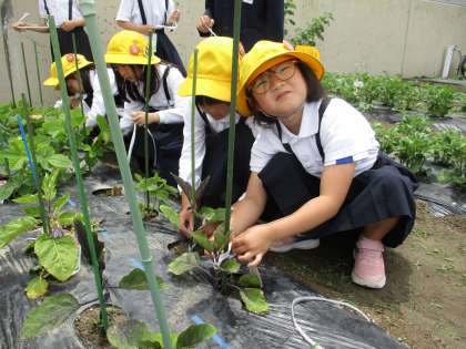 支柱に野菜のつるや茎を結び付ける「誘引」の仕方を用務員さんから教わり、「大きく育ててくださいね。実ができるといいですね」と声をかけてもらいました。立派な支柱を準備してくださった用務員さんに「ありがとうございます!」とお礼の挨拶をしました。