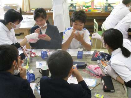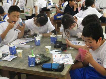 全国小学生歯磨き大会がありました。富山歯科総合学院2年生の皆さんが来てくださり、丁寧に歯磨きの仕方やフロスの使い方を教えてくださいました。