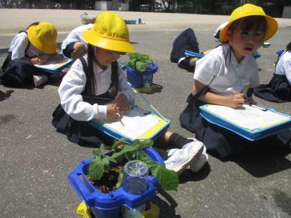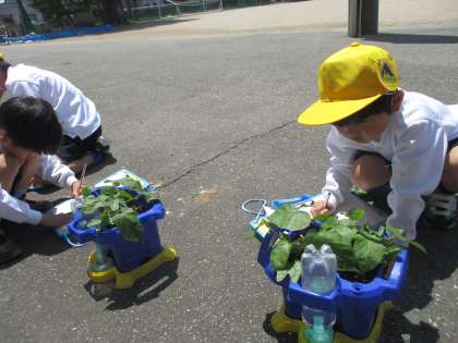 5月に植えたあさがおが大きくなり、本葉が出てきました。はじめに出てきた葉っぱと、新しくできた本葉をよく見て、形や大きさの違いをじっくりと観察しました。葉っぱが増えてきたことや、葉っぱの大きさに驚いたり、喜んだりする姿が見られました。