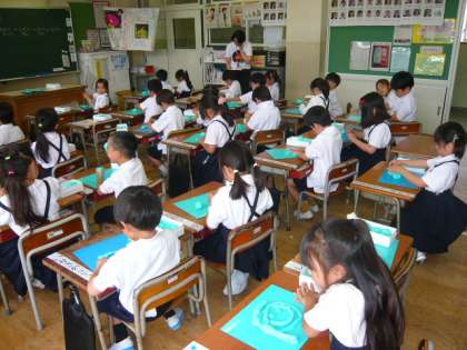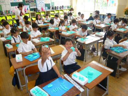図画工作科の学習で粘土を使いました。つやつやの丸い形をつくったり、紐のように長く伸ばしてみたり、ぎゅうっと握って手の形をつけたりするなど、思い思いに粘土を触って感触を楽しみました。