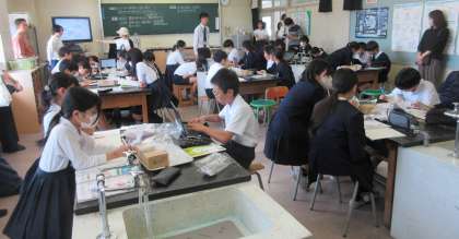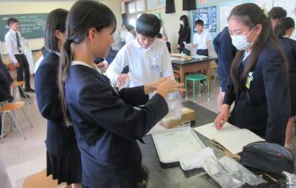 今日の学習参観の理科では「はき出した空気は、吸う空気とどこがちがうのか」について、実験を通して調べました。どのグループも仲間と力を合わせて、2種類の実験をやり遂げました。