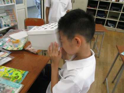 図画工作「のぞいてみると」の学習では、実際にのぞいて光の差し込み具合等を確かめながら、「のぞいて見える世界」をつくりました。