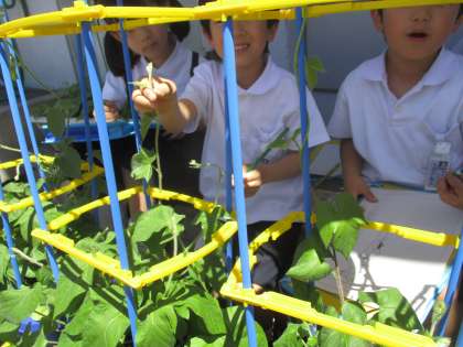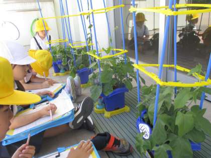 暑くなってきて、あさがおの蔓がぐんぐん伸びてきました。子供たちは毎朝水をあげながら成長を楽しみにしています。今日は、伸びてきた蔓の様子をよく観察しながら、絵を描いたり、見付けたことを書いたりしました。