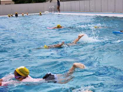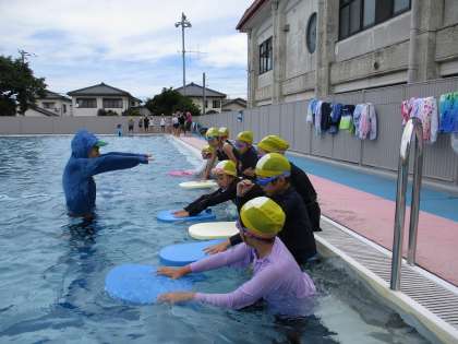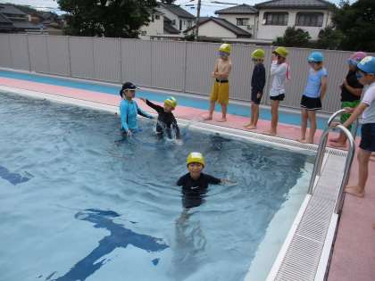 水泳教室で、ぐんぐんコースは、手足の動かし方等上手に泳げるコツを教えていただきました。のびのびコースは、水に入って動いたり、ビート板を使って泳ぐ練習をしたりして、水に慣れて楽しく遊びました。