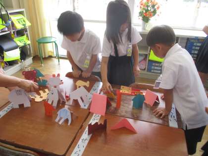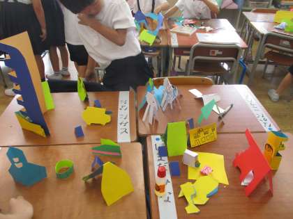 図画工作科の学習「おってたてたら」では、みんなでつくった作品を並べてグループの町をつくりました。ほかのグループの並べた町も鑑賞しました。