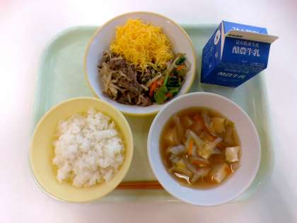 ビビンバ丼(ごはん、焼き肉、ナムル、錦糸卵)、中華スープ、牛乳 です。