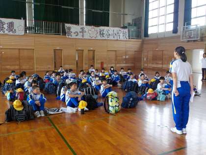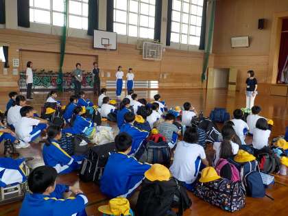 今日から2日間、6年生は国立立山青少年の家で、1泊2日の宿泊学習にチャレンジします。体育館で出発式を行い、宿泊学習がスタートしました。