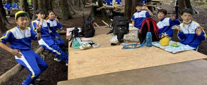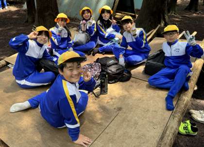 班で協力してつくった自分たちだけの基地で昼食タイム