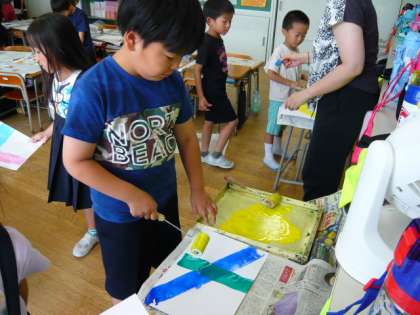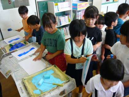 図画工作科の学習「ころころぺったん」をしました。好きな色でローラーを使って色をつけたり、積み木などの形をぺたぺた写したり思い思いの色や形を楽しみました。今日は、できた作品にすてきな題名をつけました。