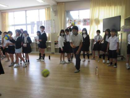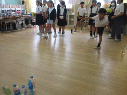 桜っ子タイムに、イベント係が企画したペットボトルボーリング大会がありました。