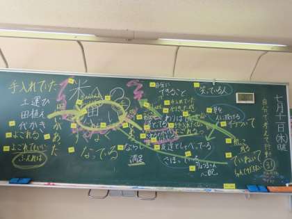 さらに、草むしり中におしゃべりしていたり、取った草で遊んでいたりする人がいたことから、「米作りへの思いが少なくなっている」という話になり、そこから「思い」や「思いのこめ方」について全員で話し合っていきました。