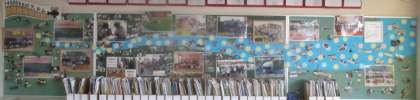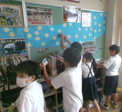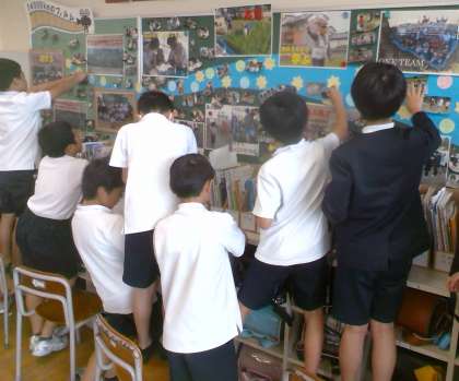 教室後方には「14000kmのフィルム」と題し、「天の川(てんのかわ)」の流れに合わせて学級の写真を掲示しています。