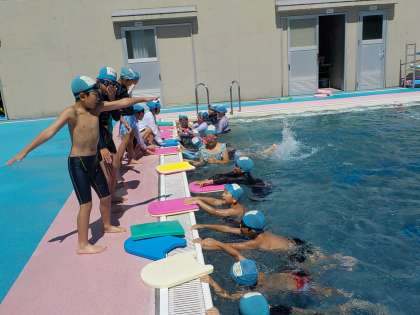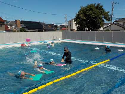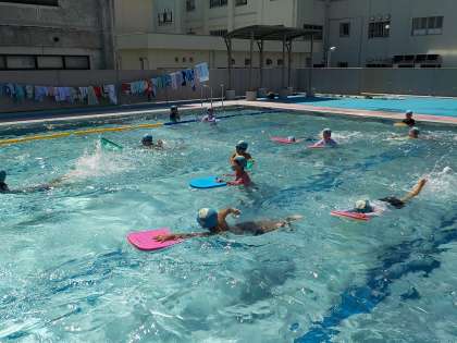 今日は、朝から晴天になり、ようやく水泳学習を行うことができました。「ドルフィンチーム」のメンバーが「めざせチーム」のメンバーに、息継ぎのコツをアドバイスしていました。メダカチームは、だんだん水に慣れ、水に顔をつけられる子も増えてきました。
