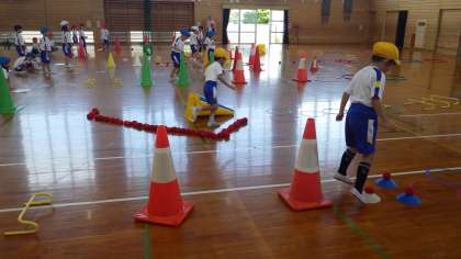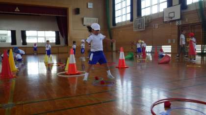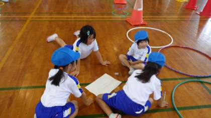 体育の学習では、リレー遊びをしています。各団で相談して、走るコースを工夫しています。カーブを描いて走ったり、けんけんぱをしたり、ジャンプして飛び越えたりと、どの団もユニークなコースをつくっていて、感心しました。