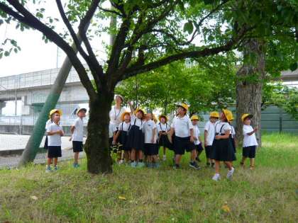 生活科の学習では、季節を見付けています。今日は、とても暑く、蝉の鳴き声が響いているのを聞いて、一生懸命に虫の姿を探していました。