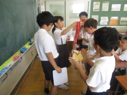 国語「どちらを選びますか」の学習では、夏休みに行くなら「海に行く派」と「山に行く派」のグループに分かれてデータなどをもとにしながら議論し、その様子を「どちらの方が説得力があったか」を見合い、1学期の国語の学習をしっかりと締めました。