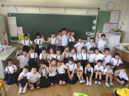 登校日ですが、1年生はなんと全員登校!夏休みに楽しかったことやまだまだ楽しみなことをたくさん話してくれました。最後にみんなで記念写真。やっぱり元気いっぱいの1年生でした。