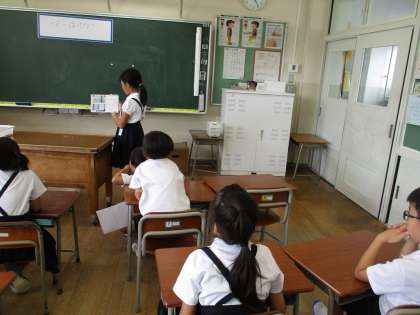 作品、自由研究、夏の思い出の中から一人一発表をしました。1組では、「だれと遊んだのですか」「どんな味がしましたか」などたくさんの質問があり、友達の話に興味津々の様子でした。