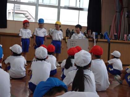 学年ドッジボール大会では、企画した運動係が、自分たちで考えたルールをみんなの前で説明しました。