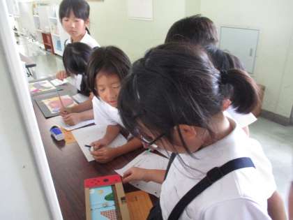 他学年の夏休みの自由研究や作品を見て、アイディアに驚き、思ったことや感じたことを思い思いにカードに書きました。