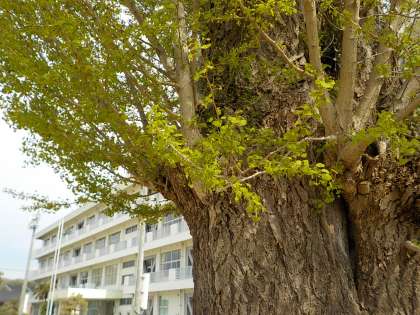 校門の近くにあるいちょうの木は、若葉が出てきています。葉は小さいですが、ちゃんといちょうの葉の形をしています。