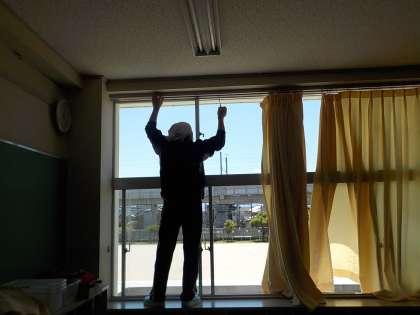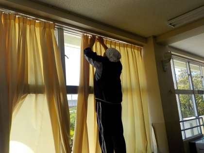 写真は、洗濯した各教室のカーテンを、付けておられるところです。プラスチックの部品が、足りなくなっているところは、新しい部品に付け替えるなど、手間のかかる作業ですが、さくらっ子が戻ってきたら、気持ちよく学習や活動ができるようにと、心を込めて作業をしてくださいました。