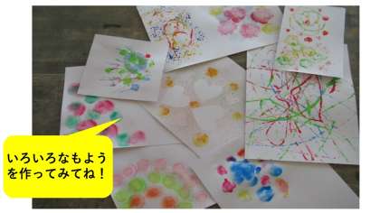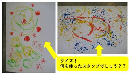 家にあるいろいろな材料を使って、スタンプするのも、おもしろいよ!先生もスタンプしてみました。何でやったか分かるかな・・・?