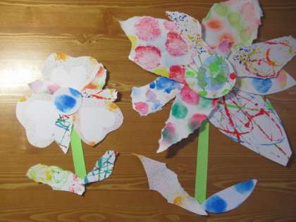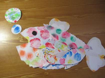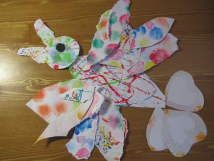 もようをいくつか作ったら、はさみで切ったり、手でちぎったりして、組み合わせて、ひとつの絵にしよう。何の絵にするか決めたら、大きい方の画用紙にのりではりましょう。クレヨンで書き足したり、折り紙をつけくわえたりしてもいいよ。みんなはどんな絵にするかな・・・?