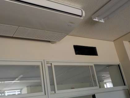 桜谷小学校では、みんなが学校に戻ってくる前に、いろいろな準備を進めています。写真は、職員の皆さんが、各教室の換気扇を一つ一つ外して、丁寧に掃除と消毒をしておられるところです。天井にある換気口は、普段はなかなか掃除しにくいところです。脚立を立てての作業は、手間がかかりますが、これも桜っ子がきれいな空気で学習や活動ができるようにするためだと、一生懸命に作業をしてくださっています。ありがとうございます。学校再開が、待ち遠しいですね。