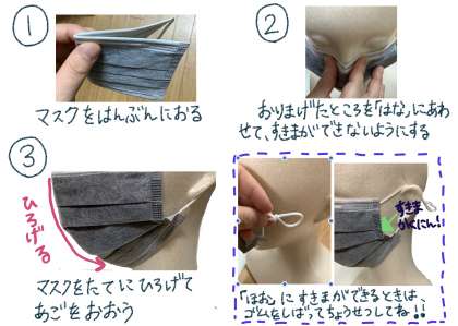 マスクをつけたときに、「はな」がでていたり、「ほお」にすきまができていませんか?
