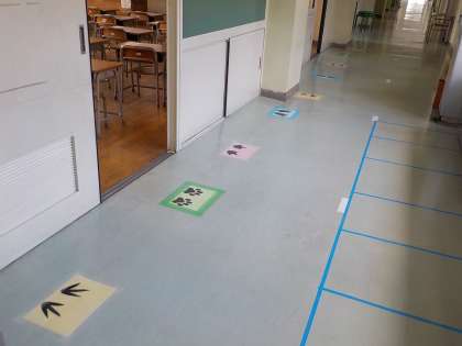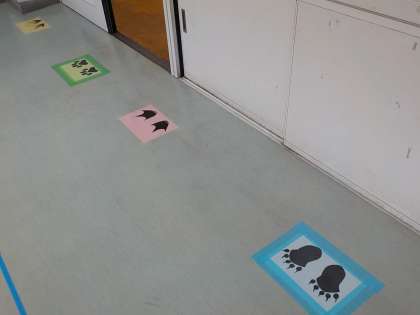 手洗いや歯磨きをする洗面所に、足あとマークを貼りました。