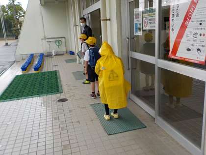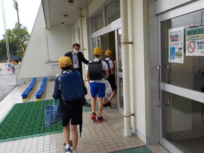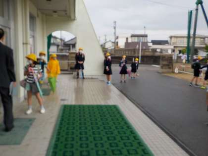 今日から、分散登校が始まりました。子供たちは、前のお友達と間を開けて並び、混雑しないように、順序よく児童玄関に入りました。
