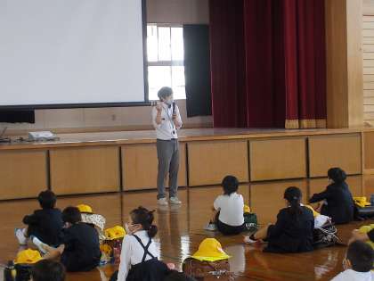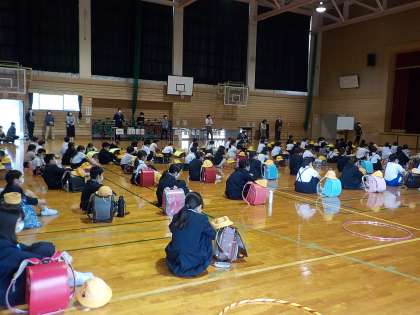 全校集会では、保健の先生、生徒指導の先生から、これからの生活のことについてのお話がありました。みんな、真剣な表情で聞いていました。