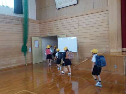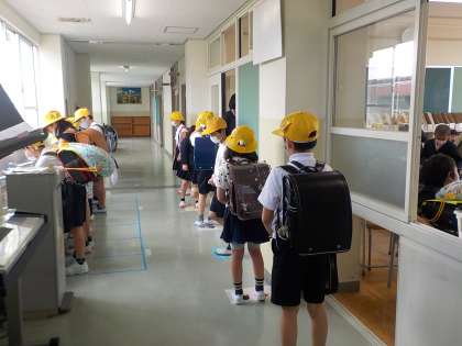 集会の後、学年ごとに教室に向かいました。まず、手洗いをしっかり行い、久しぶりの教室に入りました。