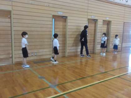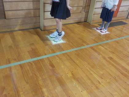 体育館のトイレも、密を避けるために、床に足型が貼ってあります。