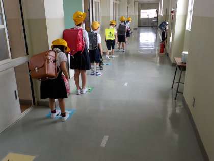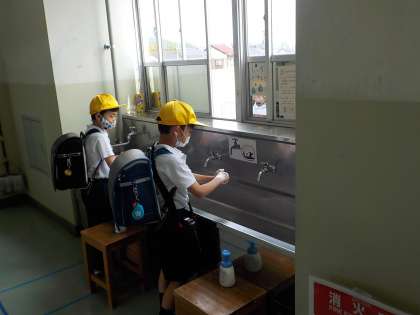 教室に入る前の、手洗いの様子です。みんな、きちんと並び、丁寧に手洗いを行っていました。