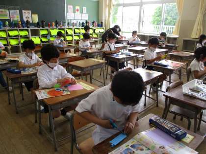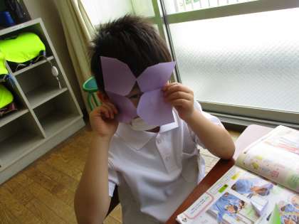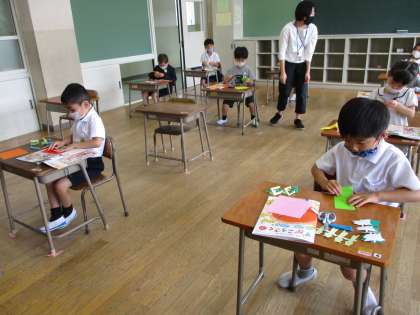 図画工作の学習で、折り紙とはさみを使ってかざりを作りました。休業中に家で一度作った経験があるからか、子供たちは「早く作りたーい!」と言いながら夢中で手を動かしていました。完成した素敵な作品は、教室に飾りたいと思います。