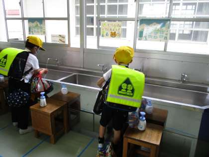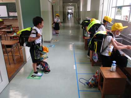 子供たちは、登校したら玄関で手をアルコール消毒し、教室に入る前にもしっかり手を洗っています。その後、荷物を片付けて朝の会が始まります。今日の様子を見ていると、片付けをする時間が先週より、だんだん短くなってきました。