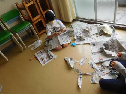 新聞紙を破いたり、丸めたり、つなげたりしながら体全体をつかって