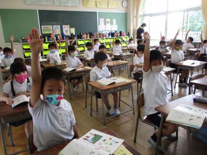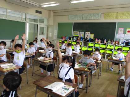 国語や算数の時間の様子です。手をまっすぐにピンっとあげて、みんなやる気があふれています。指名されたら「はいっ!」と返事をして立ち、「○○です」と答える練習をしています。みんな、徐々にできるようになってきました。