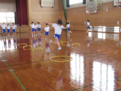 幅跳びの学習を始めました。今日は、リズムよく助走をすることと、踏みきり足を意識してミニハードルを使って練習しました。来週は、外で跳んでみます!