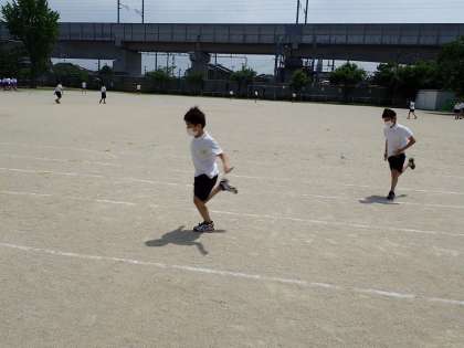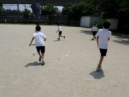 休み時間に、グラウンドで影踏み鬼ごっこをしていました。今できる遊びを考え、しっかり体を動かしています。